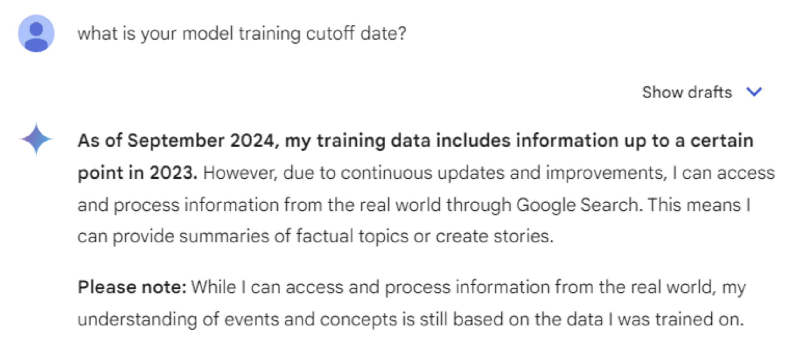 One way to visualise this is to think about asking a question to someone whose source of knowledge is limited to the latest version of an encyclopedia (i.e., they will know what happened up to the date the encyclopedia was published, but will need to wait until the next edition for newly discovered facts). The time between the present day and the last update to the training model is known as the ‘knowledge cutoff date’.